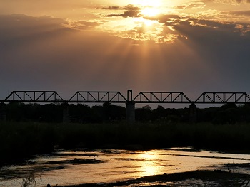Später wird es dann noch wesentlich teurer und exklusiver, wenn eine weitere Lodge eröffnet: Shalati – The Train on the Bridge. Dann können Gäste in einem umgebauten Zug auf der Selati Eisenbahnbrücke aus dem Jahr 1912 mit Pool übernachten. Der ausrangierte Zug wurde dafür umgebaut, 24 noble Zimmer befinden sich nun darin. Jedes Zimmer ist mit einem Doppelbett, einer frei stehenden Badewanne, Sitzgelegenheiten, einem Badezimmer und einem Balkon ausgestattet, eine Seite des Waggons hat große Fensterfronten. Die Nacht kostet im Doppelzimmer rund 500 Euro im Zug und rund 440 Euro an Land. Das Hotel der Thebe Tourism Group soll wohl 2020 eröffnet werden, dann sind die Zeiten vorbei als man den Sonnenuntergang nur mit Brücke in Szene setzen konnte, so wie auf dem Bild unten zu sehen.
