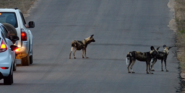Wir sind dafür zwar früh aufgestanden, aber die besten Sichtungen ahtten wir am frühen Vormittag. 2019 waren wir wieder eine Nacht in Skukuza und der Verkehr war am Anfang der Ausfahrt sehr spärlich. Dafür war aber auch so gut wie nichts zu sehen. Als aber eine Löwengruppe im Flussufer auftauchte, konnten wir die Besucher-Autos in Vierereihen nebeneinander erleben. Jeder wollte einen Blick erhaschen, die meisten haben wahrscheinlich gar nicht viel gesehen.