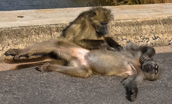 Kurz vor Lower Sabie hatten wir dann Glück und sahen endlich mal Löwen auf den markanten Felsen, die sich kurz vor dem Sunset Dam am Flussufer befinden. Wir konnten eine Lücke zwischen zwei Fahrzeugen nutzen, um schnell ein paar Fotos zu machen, die Jungtiere standen gerade auf und liefen ins sandige Flussbett. Etwa dreißig Autos in drei Reihen blockierten die ganze Straße, teilweise hatte man null Sicht auf die Tiere, die flach im Gras lagen.