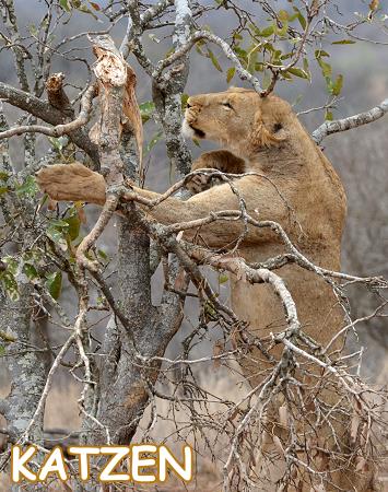 Ein Höhepunkt bei den Sichtungen im Kruger National Park sind mit Sicherheit die großen Katzen, von denen zwei auch zu den "Big Five" zählen. Wo sie sich befinden, da bildet sich schnell ein Pulk von Autos zur Beobachtung. Die gefleckten Jäger wie Leoparden, denen ich eine eigene Seite gewidmet habe, sind schon schwerer zu entdecken und Geparde sind sehr schnell und meist beim Jagen auf den Ebenen zu beobachten. Wenn sie flach im hohen Gras liegen sind sie so gut wie unsichtbar.