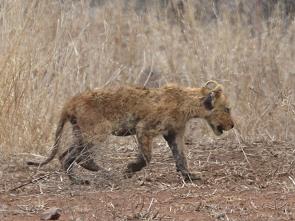 Im Mai 2013 hatten wir Glück und konnten zwei Geparde westlich von Satara eine ganze Weile beobachten. Leider lagen sie meist im hohen Gras und waren nur zu sehen, wenn sie sich aufsetzten. Ab und zu kreuzte auch mal ein einzelnes Tier unseren Weg. In Bezug auf die Fleckung ähnelt der Gepard zwar dem Leoparden, in seiner Gestalt unterscheidet er sich jedoch erheblich von ihm wie auch von allen anderen Katzen. Geparde haben extrem lange, dünne Beine und einen sehr schlanken Körper, der dem eines Windhundes sehr ähnelt. Der Kopf ist klein und rund, der Schwanz lang.
