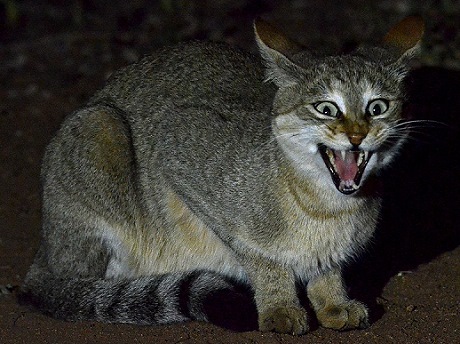 Sehr viel schwieriger ist es da, eine der zahlreichen kleineren Vertreter der Katzenartigen im Busch zu entdecken. Und um diese Arten geht es auf dieser Seite. Meist sind die auch noch nachtaktiv und sehr scheu. Das bedeutet im Fall des Kruger National Park, entweder man sieht sie zufällig auf einem der geführten nächtlichen Game Drives, oder sie kommen von sich aus ins Camp. Ab und zu wurden sie wahrscheinlich illegal gefüttert, denn bisher haben wir sie nur innerhalb der Grenzen eines Camps gesehen. Füttern ist im Nationalpark natürlich streng verboten, was aber manche Zeitgenossen nicht davon abhält.