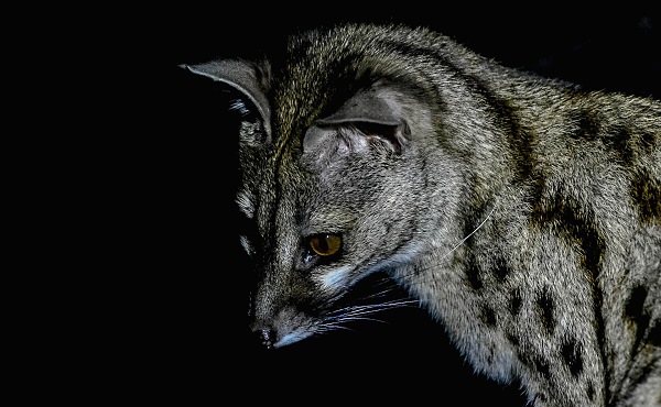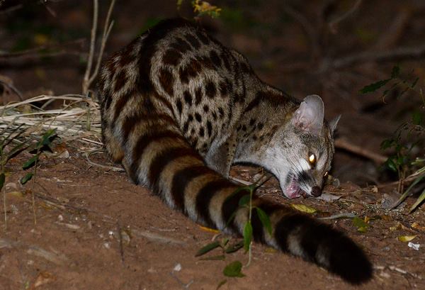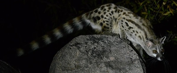 Am häufigsten sieht man Ginsterkatzen in der Nähe der Camps. Sie kommen am Abend an den Hütten vorbei, weil sie gelernt haben, dass beim Grillen so manches leckere Fleischstück auf den Boden fällt und für sie leichtes Futter ist. So werden in der Nacht die Grillplätze inspiziert, wer sich auf die Lauer legt kann die scheuen, nachtaktiven Katzen beobachten. Wir hatten besonders schöne Erlebnisse im Boulders Camp.