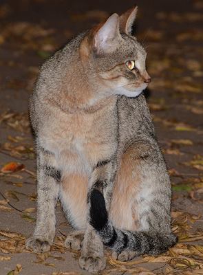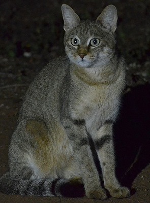 Ein etwas anderer Fall war wohl die afrikanische Wildkatze auf den Fotos, die uns im Camp Satara besuchte. Früh am Abend erschien sie recht unerwartet im den Lichtkreis von unserem Bungalow. Sie hat nicht gebettelt, sondern war auf der Suche nach Insekten oder Mäusen, die von dem Licht oder dem Nahrungsangebot ruqnd um die Bungalowküchen angelockt wurden. Leider bewegten sich nur ein paar trockene Blätter, denen sie hinterherjagte. Wir konnten ein paar schöne Fotos machen, weil die Kamera immer griffbereit liegt und wir deshalb schnell genug reagieren konnten.