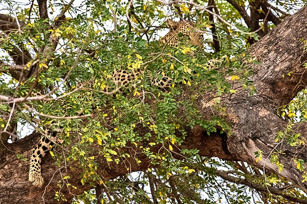 Und im Oktober 2019 klappte es dann auch endlich mal mit einer Sichtung, die uns bisher noch fehlte: Eine Leopardin mit Beute oben im Baum. Und nahe Punda Maria hatten wir dann noch zwei Leoparden im Baum, die am Anfang sehr gut getrant waren. Nur ein paar Autos standen davor und wir konnten die Tiere ganz in Ruhe betrachten.