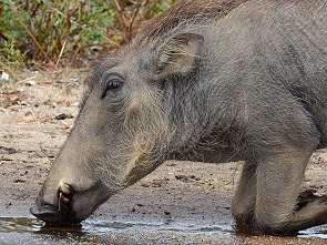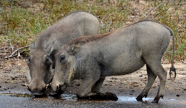 Die unteren Eckzähne sind ebenfalls verlängert, sie sind kürzer, aber schärfer. Warzenschweine sind Allesfresser, die sich aber vorwiegend von Pflanzen ernähren. Beim Fressen lassen sie sich auf die Handgelenke nieder und schieben sich in dieser Haltung vorwärts, das sieht aus als wenn sie knien. Unten auf dem Bild trinken sie so auch aus einer Pfütze nach dem Regen.