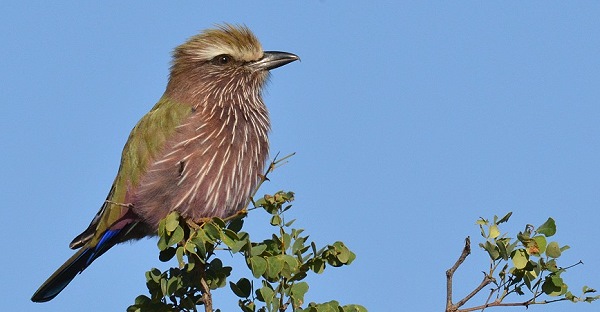Die Strichelracke (Coracias naevia - Purple Roller) erkannt man sofort an den weißen Strichen auf dem Bauchgefieder. Verglichen mit anderen Rackenarten sind ihre Farben auch eher gedeckt und ihr Ruf ist ziemlich rau. Das bevorzugtes Habitat ist die trockene Dornbuschsavanne, wo sie lange Zeit damit zubringt, auf den Spitzen von Dornbüschen anzusitzen und nach Beute Ausschau zu halten. Sie vertilgt die gleichen Beutetiere wie die Gabelracke.