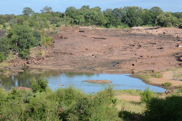 Der Name Redrocks bezieht sich auf eine große Sandsteinplatte, die weit ins das Flussbett des Shingwedzi River hineinreicht. Die malerische Verwitterung der Gesteine und Mineralien durch chemische, physikalische und biologische Prozesse hat hier eine einmalige Landschaftsform geschaffen. Das Wasser des Flusses schuf steile Felswände, das Rot dieser Felsen entstand durch spezielle Bakterien. Doch im April hatten wir hier nicht viel Glück mit Tiersichtungen. Die Flut Anfang 2013 hatte die Region sehr verändert, auch auf der R 52 sahen wir nur ein paar Antiolopen und kleinere Tiere wie Zwergmangusten und einen fliehenden Hasen. Auch Frankoline und Sandflughühner gab es in der Region reichlich.