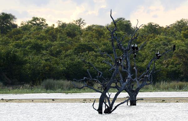Der andere Damm ist über eine 8 Kilometer lange Zufahrt zu erreichen. Er ist sehr groß mit vielen toten Bäumen, auf denen wir mit dem Fernglas weit entfernt Kormorane mit weißem Kopf brüten sahen und auch einen Fischadler entdecken konnten. Viel Stellplatz zum Beobachten gibt es hier leider nicht, nur für maximal zwei bis drei Autos ist in der kleinen Schleife Platz. Den Damm selbst kann man nicht befahren, aber die Fahrt hierher lohnt sich auch aus anderen Gründen nicht: Am Morgen und frühen Vormittag schaut man noch nicht direkt gegen die Sonne, spätestens ab Mittag wird man hier aber nur geblendet und es lohnt sich gar nicht die 12 Kilometer vom Csmp hierher zu fahren. Daher waren wir auch als einzige unterwegs. Am späten Nachmittag gibt es zwar gutes Licht, aber leider direkt von vorne - nicht nur für Fotografen, sondern auch für die Tierbeobachtung miserable Bedingungen.