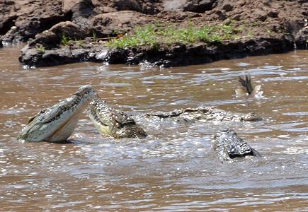 An einem Aussichtspunkt trauten wir unseren Augen kaum, da saß ein Veranstalter mit seinen Gästen seelenruhig auf Campingstühlen neben dem Landrover in der Wildnis. Nur wenige dutzend Meter weiter war ein Nyalabock ertrunken oder gerissen worden und trieb im trüben Wasser. Zahlreiche Krokodile hatten sich zu diesem Festmahl eingefunden. Unterschiedliche Größen, von ganz klein bis hin zu einem geschätzten Sechs-Meter-Brocken zupften am Kadaver und hielten ihn die meiste Zeit unter Wasser. Der Fluss brodelte von all den Leibern, einige lagen auch am Ufer und hatten sich scheinbar schon satt gefressen. Eimal machte das größte Krokodil mit dem toten Bock inmitten all der anderen Reptilien "die Rolle", d.h. es drehte den Kadaver, um dabei Fleisch heraus zu reissen. Da kocht das Wasser!