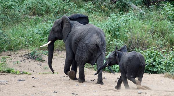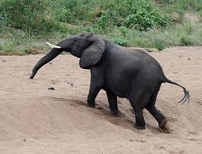 Schön zu beobachten war eine Elefantenfamilie, die den Fluss überquerte. Am gegenüber liegenden Ufer hatten sie sichtlich Mühe, die tiefen Sandufer zu überwinden. Die schweren Tiere stapften mühsam die Böschung hoch um sich dann dort über das Grünfutter herzumachen. Drei Jungtiere schauten sich das genau an, trompeteten dann kurz ein Startsignal und begannen einen kurzen Wettlauf, um die Düne mir Schwung zu nehmen.