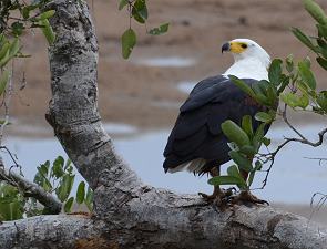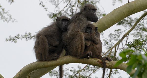 Am frühen Morgen war hier im Flussbett eigentlich immer etwas los. Krokodile und Hippos liegen im Wasser, dazu sieht man überall Wasservögel. Neben kleineren Antilopen, Wasserböcken und Nyalas konnten wir auch viele Paviane entdecken, die noch halb schlafend im Morgennebel auf den Bäumen saßen. Die Sonne war noch nicht aufgegangen, der Himmel bewölkt und unter den Bäumen war es noch dunkel. Auch Hornraben entdeckt man um diese frühe Tageszeit eher oben im Baum als auf Futtersuche am Boden.