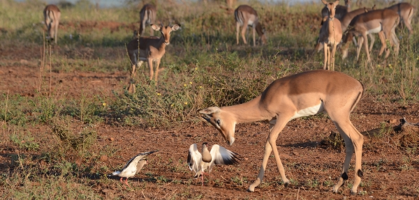 Die ersten paar Kilometer hinter Crocodile Bridge fährt man durch ein Waldgebiet mit Grasebenen dazwischen, auf denen man das ganze Jahr über viel Wild findet. Ein gutes Gebiet für Giraffen und gemischte Herden von Impalas und Zebras. Das Impala auf dem Bild weiter unten kam zu nah an ein Nest auf dem Boden brütender Kiebitze. Diese wussten ihre Brut sehr gut zu verteidigen und irritierten das Impala so sehr, dass es erst attakierte und dann abdrehte.