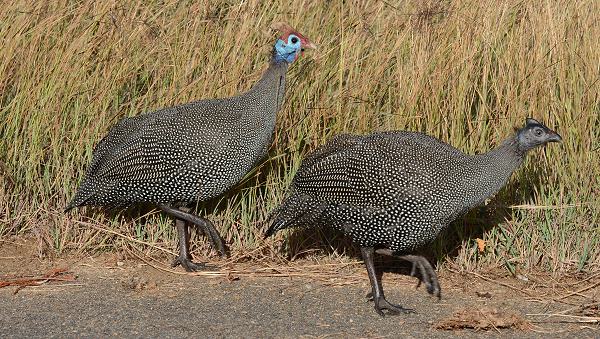 Wie überall gehört auch hier Glück dazu, wir haben an dem Morgen, als wir vom Camp kamen, relativ wenige Tiere gesehen. Die ersten waren große Gruppen von Perlhühnern auf der Straße. Die Vögel übernachten aber auch auf dem Busparkplatz innerhalb des Camps und sind dort eher noch besser zu beobachten. Beim Anblick der vielen großen Gruppen von Hühnervögeln wird aber klar, wovon die Leoparden hier angezogen werden.