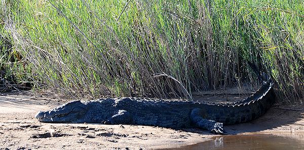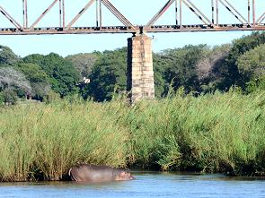 Die Straße überquert den Sand River und hier von der Brücke aus hat man immer einen schönen Blick auf Tiere. Oft liegen Krokodile auf der Sandbank am Ufer, Hippos spielen im Wasser und tauchen prustend auf und zahlreiche Wasservögel sind am Ufer zu sehen. Leider ist der Verkehr hier meist heftig und die Brücke schmal, so dass man nicht sehr lange zum Beobachten stehen bleiben kann.