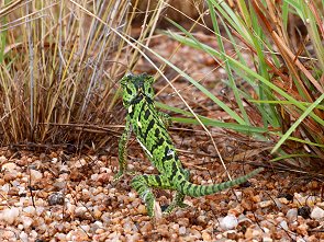 Natürlich statteten wir zuerst dem Sable Dam einen Besuch ab. Im letzten Jahr hatten wir hier eine große Elefantenherde beobachtet, zu sehen auf der Seite Sable Dam. Auch eine neue Schleife gab es für uns, die wir noch nicht gefahren waren: den westlichen Teil der S131, 16 Kilometer lang. Sie beginnt an der H14, führt vorbei am Ngwenyeni Waterhole und endet kurz vor dem Tor auf der H9. Sehr viele Tiere haben wir dort an einem bedeckten Tag nicht gesehen, nur ein paar Impalas, die mitten auf dem Weg lagen. Dazu Warzenschweine, Büffel, Krokodile, Kudus, Wasserböcke, Geier und ein hübsches grünes Chamäleon.