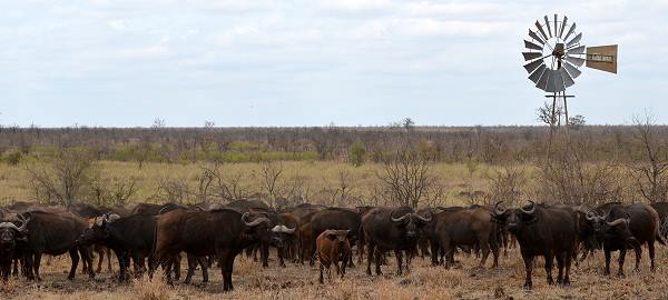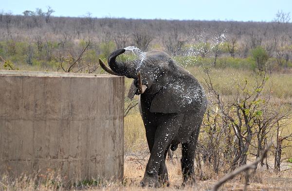 Eine riesige Büffelherde von bestimmt über 400 Tieren hielt sich am Wasserloch von Nshawu auf. Diese mächtigen Tiere sind völlig furchtlos, kein Wunder, bei der Menge. Wie heißt es doch so passend? Security by Numbers! Einige kleine Büffel haben wir dann noch portraitiert, danach entdeckten wir den Elefanten am Wassertank. Er hatte sichtlich Spaß und duschte auf Kruger Art mit seinem Rüssel.