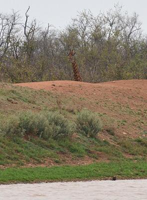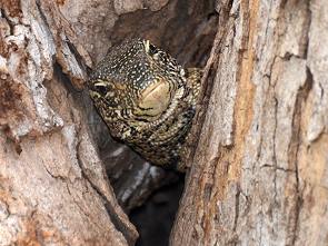 An Stelle der Asphaltstrecke sind wir dann noch einen kleinen Umweg über die Gravel Roads S132 und S131 gefahren. Am N'wanetsi Wasserloch hatten wir dann Glück. Während wir noch auf den Tümpel starrten und auf Besuch hofften, entdeckten wir plötzlich im nahen Baum einen Baumwaran, der aus seiner Höhle guckte. Sonst war bis auf ein paar Nilgänse nicht mehr viel zu sehen und gegen Mittag erreichten wir das Letaba Main Camp. Dort trafen wir M@rie aus dem Reiseforum, im Restaurant, verspeisten einen Chicken Burger mit Fritten und gingen danach im Shop noch etwas einkaufen und ein Eis essen.
