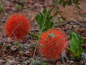 Die schmale Gravel Road führt weiter durch hügeliges Gelände und am Wegrand wuchsen einige sehr auffällige , knallrote Blüten. Sie leuchteten im kargen Bushveld und sind nicht zu übersehen. Es handelt sich dabei um die Feuerball-Lilie, auch blood lily, torch lily, powderpuff lily oder fireball lily genannt (Scadoxus multiflorus). Es ist ist eine Pflanzenart aus der Familie der Amaryllisgewächse. Scadoxus multiflorus stammt ursprünglich aus Afrika und besiedelt dort zahlreiche Habitate, auch die 4 Nordprovinzen Südafrikas plus Swasiland, Mosambik, Simbabwe, Namibia und Botswana. Wir haben sie im Oktober nur hier in der Region am Phalaborwa Gate gesehen, meist wuchsen sie im Schatten von Bäumen.