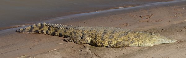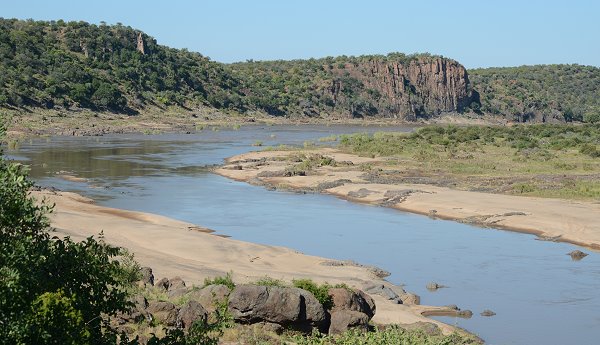 Nach etwa 3 Km verlässt man den Letaba River und es geht über einen felsigen und kargen Bergrücken hinüber zum Olifants River. Am Olifants Lookout angekommen darf man endlich sein Auto verlassen und kann hoch über dem Olifant River stehen. Der Zusammenfluss mit dem Letaba River ist erst 5 Km weiter westlich ausser Sicht. Der Rundblick ist sehr schön, man schaut auf flussauf- und flussabwärts auf einige steile Felsenwände und unterhalb der Absperrung liegen meist etliche Hippos im Wasser. Wenn man Glück hat, dann nähern sich auch Tiere zum Trinken. Da wir mittags vor Ort waren, sahen wir nur eine Gruppe Impalas. Und je länger man schut, um so mehr Krokodile in allen Größen entdeckt man am schlammigen Ufer.