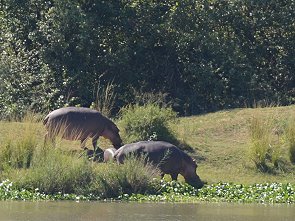 Eines der Hippos im Familienverband direkt unter dem Aussichtspunkt war etwas Besonderes. Das arme Tier hatte sicherlich bei einem Kampf einen Teil des Oberkiefers verloren. Hell leuchteten die nun frei liegenden Stoßzähne im Wasser. Ein sehr markantes Tier, das sicher von jedem Besucher hier fotografiert wird.