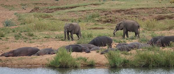 Wir hatten Glück und in der Nacht zog ein schweres Gewitter über das Camp. Die Hippos haben das scheinbar geahnt und kamen bei bedecktem Himmel schon am Nachmittag zum Grasen ans Ufer, ein eher seltener Anblick. Im Wasser leben auch Krokodile und am Ufer grasen oft Elefantenherden.