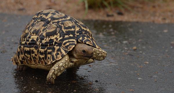 Es hatte nachts geregnet und dem entsprechend waren nicht sehr viele Tiere unterwegs. Eine Schildkröte lag auf der noch nassen Straße und schaute misstrauisch aus ihrem Haus. Danach war sie schnell verschwunden und wollte nicht mehr als Modell herhalten. De Rest der Strecke war langweilig unspektakulär. Mehr als die Hälfte der Elefantenpopulation im Park soll hier in dieser Region leben. Gesehen haben wir nicht sehr viele, allerdings waren ihre Spuren überall zu sehen. So viele umgeknickte und zerstörte Baume und Sträucher gab es sonst nirgendwo. Die H14 mündet nach 33 Kilometern auf die H9. Von hier aus kommt man, ebenfalls auf Asphalt, zum Phalaborwa Gate oder zum Letaba Main Camp, dem zweitgrößten Camp im Park. Dem entsprechend ist dieser Abschnitt auch viel befahren, was es hier zu sehen rechts und links der Strecke zu sehen gibt habe ich auf der Seite Phalaborwa Region näher beschrieben.