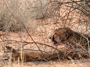 Ganz in der Nähe von Auchterlonie hatten wir dann noch einmal Glück, als wir den Park verlassen wollten. Ein paar Autos standen am Wegrand und wir konnten uns mit Glück so platzieren, dass wir die beiden Geparde sehen konnten. Sie hatten sich am Morgen eine kleinere Antilope gefangen und einer kaute noch genüsslich im Schatten eines Baumes auf seiner Mahlzeit herum, während der andere sich daneben ausruhte und Wache hielt.