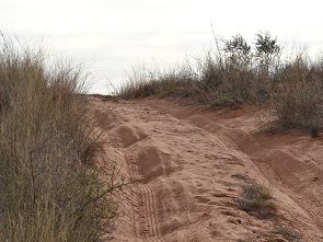 Es folgten noch ein paar Tiefsandfahrten über Dünenkämme, bei einem brauchten wir dann auch mal einen zweiten Anlauf. Das lag weniger an Steigungen, sondern eher an den von anderen Fahrern ausgefahrenen und gepflügten Fahrspuren unterhalb der Steigung, die schon viel vom Schwung nehmen. Die Bodenwellen im Sand rütteln einen ganz schön durch, aber da darf man nicht bremsen oder langsamer werden, sonst bleibt man stecken. Die anderen Dünen haben wir mit unserem Auto dann doch eher bequem geschafft. Das größte Hindernis liegt dann fast am Ende der Ausfahrt, die letzte Düne hat es in sich. Unten auf Google Maps ist sie mit ihrer Umgehung zu sehen, auf dem letzten Foto die beiden Fahrspuren.