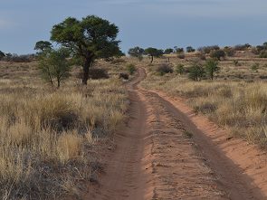 Nachdem wir die beiden fotografiert hatten, sind wir weiter gefahren und mussten dann auch schon die erste Sanddüne in Angriff nehmen. Die war noch harmlos, aber mit Tiefsand ist nicht zu spaßen. Da hilft nur Schwung und viel Gefühl im Gasfuß. Man darf nicht zum Stillstand kommen, dann muß man zurück und neuen Anlauf nehmen. Unterwegs kommt man noch an einem Wasserloch namens Dankbaar vorbei, an dem sich aber weit und breit kein einziges Tier zeigte. Nachdem wir eine Weile gewartet hatten, beschlossen wir dann weiter zu fahren. Schließlich wollten wir im Waterhole-Hide in Nossob noch eine Pause machen und mussten danach an diesem Tag noch bis nach Urikaruus weiter fahren.