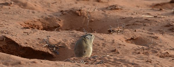 Die Löwen vom Vortag haben wir am Morgen leider nicht mehr gesehen, wahrscheinlich lagen sie einfach nur unsichtbar hinter einem Dünenkamm. Nach einigen Hundert Metern erreicht man die Abzweigung, wo sich Zufahrt und Abfahrt trennen, ab hier ist es wieder Einbahnstrasse bis zum Hauptweg im Nossob-Tal. Die Landschaft wird nach ein paar Kilometern mehr von Dünen durchzogen und am Wegrand sieht man überall im Gras kleine Löcher. Es ist schwierig, die kleinen Bewohner, die Pfeiffratten (Parotomys brantsii), mit der Kamera zu erwischen. Die scheuen Tierchen haben mehrere Ein- und Ausgänge und ein weit verzweigtes Höhlensystem, so dass man nie errät, wo sie sich gerade zeigen. Aber neugierig sind sie schon und so konnte ich mit etwas Geduld doch noch ein paar Bilder machen. Da die Dünen von Löchern übersäht waren wie ein Schweizer Käse, muss es sehr viele von den kleinen Wühlern geben.