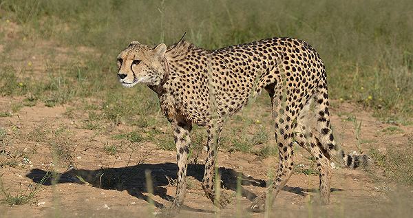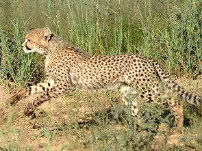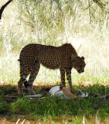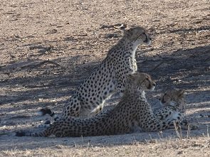 Geparde (Acinonyx jubatus) sind oft schwer zu erkennen, denn ihre Tarnung ist wirklich hervorragend. Liegen sie ruhig im Schatten eines Kameldornbaumes oder oben auf einem Dünenkamm muss man schon viel Glück haben um sie überhaupt zu sehen. Meist wird man auf die Tiere aufmerksam, weil ein anderer Besucher dort steht und mit Fernglas schaut. 2010 sahen wir nur einmal welche, eine Mutter mit zwei Jungtieren.