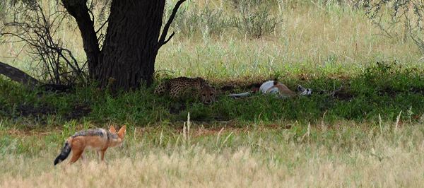 Bei unserem Besuch im März 2011 hatten wir dann mehr Glück. Dr. Gus Mills vom Cheetah Project war mit seinem markanten, sandfarbigen Landrover unterwegs. Wo dieses Auto stand, da war auch eine Gepardin nicht weit. Wir sahen den netten Dr. Mills mehrmals, hielten einen kleinen Schwatz und bekamen stets gute Informationen. Einmal machte er uns auf eine Gepardin auf der anderen Talseite aufmerksam, die gerade an einem Springbock nagte. Während wir sie beobachteten und trotz der schwierigen Lichtverhältnisse und der Entfernung Bilder machten, kam auch noch ein Schakal vorbei. Er wollte gerne etwas von der Beute ab haben, wurde aber von der Besitzerin verjagt. Am nächsten Tag konnten wir ihn beobachten, wie er ganz in der Nähe der Stelle mit dem Springbockschädel im Maul herumlief.