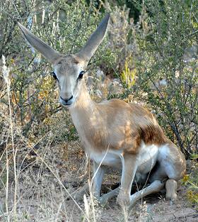 Wir rumpeln über die Piste in Richtung Restcamp, hinter uns eine riesige Staubfahne herziehend. Überall dort, wo es ein Wasserloch gibt, halten wir kurz an und wenn es etwas zu sehen gibt auch gerne ein wenig länger. Nach Melkvlei in Richtung Norden heißen die Wasserstellen Gunong, Kransbrak, Jan se draii und Kameelsleep. Draii ist das Wort für Umkehr auf Afrikaans, hier kehrte ein Nama namens Jan auf dem Weg in die Kalahari mal um, so einfach ist die Namensvergabe.