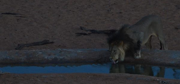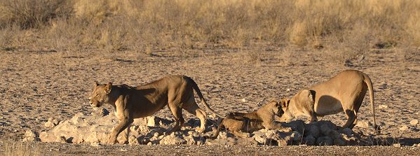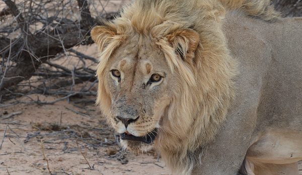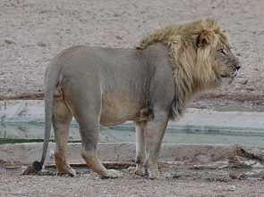 In Wilderness Camp Urikaruus waren es Löwen, Hyänen, Oryx und Eland, die tagsüber und nachts ans Wasserloch kamen. An unserem letzten Tag waren gerade alle anderen Bewohner zum allmorgendlichen Game Drive aufgebrochen, während wir in Ruhe packten, um dann ohne Eile aus dem Park zu fahren. Tagesziel war das Vergelegen Guesthaus im nicht so weit entfernte Kakamas. So hatten wir Glück, denn kaum waren alle weg und es herrschte Ruhe im Camp, da kam ein wunderschöner blonder Löwe zum trinken.