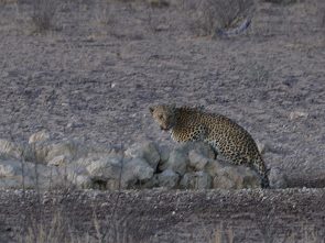 In Grootkolk hatten wir ebenfalls viel Glück am Wasserloch, denn hier kamen nicht nur Löwen und eine braune Hyäne trinken. Auch den einzigen Leoparden in diesem Urlaub sahen wir hier am frühen Morgen bei ganz schlechtem Fotografierlicht, später dann noch mal in der Sonne am Hauptweg. Die Antilopen wie Oryx oder Kuhantilopen, die zum Trinken kamen, spürten die Nähe der Löwen und waren sichtlich nervös.