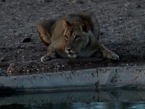 Im Mata Mata Camp liegen die Wasserstellen im Flussbett, von den River Chalets und vom Campingplatz aus schaut man direkt auf das Treiben. Wer nicht direkt am Zaun wohnt, kann sich auch in einen Hide setzen, der direkt über der Absperrung erreicht wurde. Hier konnten wir bei unserem Aufenthalt im November jede Nacht Löwenrudel sehen, die von unseren direkten Nachbarn wunderbar angeleuchtet wurden. Oben ist ein Foto zu sehen, mit dem Fernglas konnten wir die Kleinen beim Spielen beobachten, tagsüber haben wir sie leider nicht gesehen.