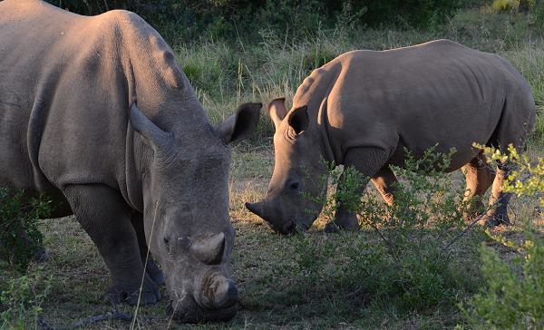 In der Umgebung findet man zahlreiche Vogelarten, Reptilien und natürlich auch größere Tiere. So wie Breitmaulnashörner, wir haben beim Game Drive am Nachmittag alleine 7 Stück auf einmal gesehen. Am Wasserloch waren ebenfalls vier Tiere versammelt. Es gibt einen Bullen namens Samson mit drei Kühen, die jeweils Nachwuchs haben. Wunderbar war es zu beobachten, wie die Kleinen spielerisch am Wasserloch ihre ersten Kämpfe ausgetragen haben. In den Videos auf der Seite Wasserloch sind Szenen davon zu sehen.