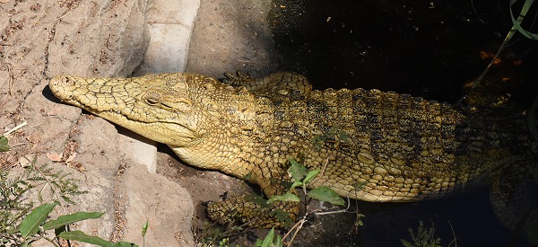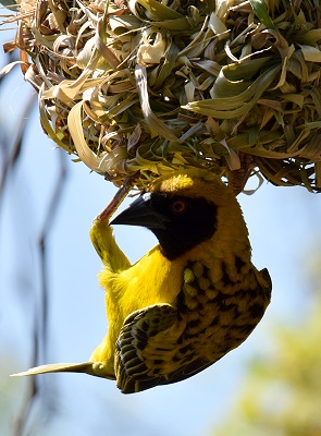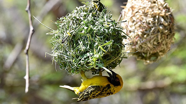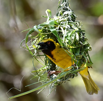 Hier waren es nicht ganz so viele, aber die Männchen der Maskenweber (Ploceus velatus) waren jetzt kurz vor der Balz eifrig mit dem Nestbau beschäftigt. Den Anfang macht ein einziger rundgebogener Grashalm, um den stetig neue Halme gewoben werden. Die einzigen Werkzeuge, die der Webervogel hat, sind dabei sein Schnabel, um zu weben und seine Füße, um alles in Form zu ziehen. Und wir konnten sie hier recht nah betrachten, denn die Nester hingen direkt in den Bäumen am Rand eines Gewässers, in dem sich die Krokodile befinden.