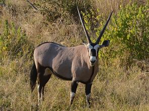 Dann führt die Fahrt weg vom Fluss und man durchquert wunderschöne Landschaften mit roten Felsen und schönen Aussichten. Je nach Tageszeit, wir sind die Strecke mehrmals gefahren, leuchten die roten Brocken mal mehr und mal weniger intensiv. Dazwischen immer wieder Ausblicke ins weite Land und hinüber nach Zimbabwe. Es gibt sogar Oryx Antilopen in der Region, wir sahen hier auch Elefanten, Eland, Zebras, Impalas, Klippspringer und Giraffen.