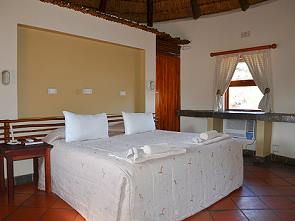 Dort angekommen gibt es einen Wegweiser nach rechts zu den Chalets, diese sind typisch afrikanische Rondavels mit Strohdach, dazu stylisch und mit jeglichem Komfort ausgestattet. Wir hatten im Oktober 2011 zwar ein Jahr im Voraus gebucht, aber leider waren die 14 kleineren Hütten für 2 Personen an einer von den drei Nächten bis kurz vor unserer Abfahrt komplett ausgebucht. Wahrscheinlich von einem Veranstalter geblockt, der sein Kontingent dann doch nicht verkauft hat. Denn voll war es an diesem Tag nicht, nur eine Reisegruppe in einem kleinen Bus kam an.
