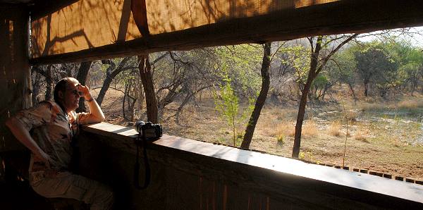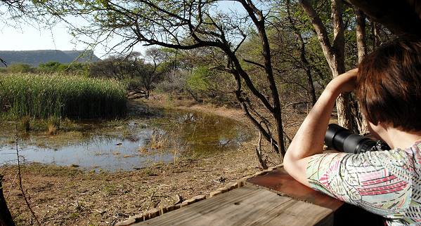 Im Bird Hide sitzend überblickt man ein hübsches Wasserloch mit viel grünem Reetgras. Dort leben Teichhühner, Webervögel und viele andere Vögel lassen sich am Rand des Damms zum Trinken nieder. Auch ein großer Nyala-Bock, der sich von unserer Anwesenheit nicht stören ließ, und ein paar Schweine tauchten auf. Ein friedlicher Ort mit nur wenigen Besuchern. Hier hätten wir gerne noch etwas mehr Zeit gehabt.