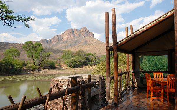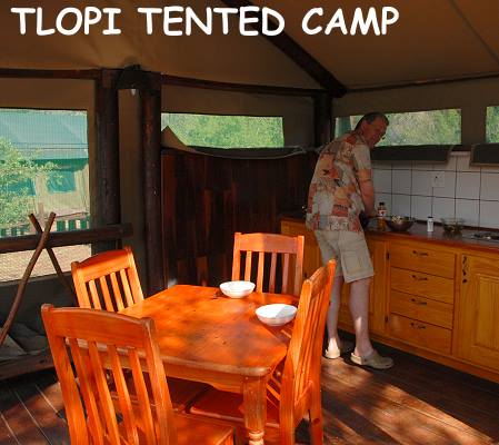 Das Tlopi Tented Camp liegt malerisch am Apiesrivierpoort Stausee, der von dem Fluss Tlopi gespeist wird. Der Name ist abgeleitet von Motlopi. So heißt in der Sprache der Tswana der Witgat-Baum (lat. Boscia albitrunca, auch Stinkbusch, Schäferbaum oder stinkender Hirtenbaum genannt), der hier an den Ufern weit verbreitet ist. Ursprünglich stand das Zeltlager einmal 15 Kilometer weiter nordöstlich am Ufer des Matlabas River, wurde dann aber verlegt.