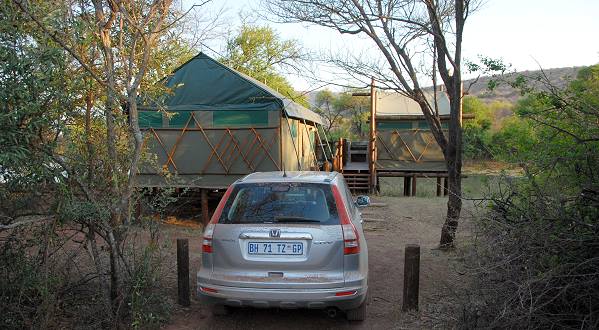 Zu unserem Leidwesen hat man hier aber auch Mobilfunk-Empfang und die südafrikanischen Nachbarn im Zelt Barbet nebenan verbrachten lautstark telefonierend und sonnenbadend ihre Zeit auf der Terrasse. Auch beim Grillen am Abend wurde pausenlos und laut gequatscht. Als am Morgen nach dem Frühstück dann noch rythmisches Stöhnen aus dem Nachbarzelt zu uns herüberdrang haben wir die Flucht ergriffen. Schließlich hatten wir an diesem Tag bis zum Mapungubwe National Park ja noch eine weite Fahrstrecke vor uns.