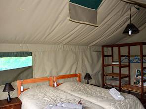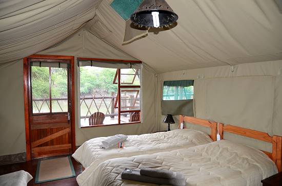 Die erste Zufahrt führt alleine zum Zelt Plover, die nächste zu den nächsten zwei Zelten, die übernächste zu 3 Zelten und die letzte zu den übrigen 4 Zelten, die dann wieder kurze Einzelzufahrten haben. Grundsätzlich kann man sagen, je weiter am Ende um so besser die Lage. Bei den letzten Zelten liegt das gegenüber liegende Ufer nämlich näher und Tiere lassen sich so besser beobachten. Lourie ist das letzte Zelt, das zudem noch den Vorteil hat nur auf einer Seite einen Nachbarn zu haben.