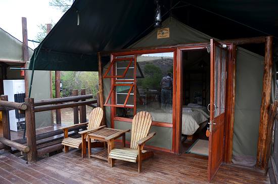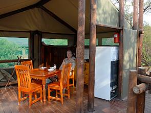 Die Veranda vor dem Schlafzelt ist mit zwei gemütlichen Holzsesseln und einem kleinen Tisch möbliert und führt zur offenen, voll eingerichteten Küche mit Kühlschrank und elektrischen Kochplatten. Davor sitzt man, durch eine Plane wind- und blickgeschützt, am Esstisch. Auf der Veranda gibt es neben Tisch und 4 Stühlen auch einen festen, gemauerten Barbeque Grill für Freunde des offenen Feuers.