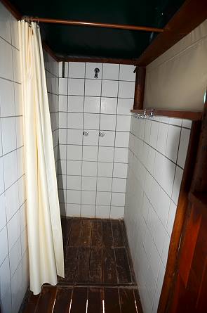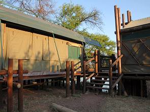 Die Unterkünfte im Tlopi Tented Camp bestehen, wie der Name schon vermuten lässt, aus Safari Zelten mit möbliertem Vorbau. Das Auto parkt man direkt davor, dann führt eine breite Holztreppe hoch zu einer Plattform. Im Wohnzelt befindet sich ein Duschbad mit Toilette. Es gibt weiße Fliesen und das Duschwasser verschwindet nach unten durch die durchlässigen Holzplanken in die Natur. Mit Duschgel oder Shampoo sollte man hier also sehr sparsam umgehen oder besser ganz darauf verzichtenm, da alles direkt im See landet. Am Eingang zum Schlafraum gibt es eine feste Türe, die man schließen kann und richtige Glasfenster mit Fliegengitter. Rundum sorgen mit Fliegengitter verschlossene Zeltfenster mit Klappe davor für gute Durchlüftung. Es gibt Strom im Raum, somit Licht und sogar Heizdecken im Bett für kalte Nächte. In der Nacht war es sehr windig, was ein heftiges Flattern der Zeltwände und somit einen ziemlich unruhigen Schlaf zur Folge hatte.