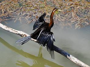 Wir bekamen das drittletzte Zelt namens Cormorant und bei unserer Ankunft saß auch gleich ein hübscher schwarzer Darter genau vor unserem Zelt auf einem Ast im Wasser. Wie passend.