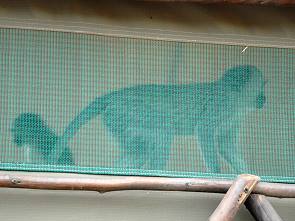 Nach dem Essen also immer gleich spülen und alles wegschließen und vor dem Essen den Tisch nicht allein lassen - wir konnten Affenbesuch und Diebstahl einer Plastikdose bei den Nachbarn beobachten. Die Tiere haben schneller etwas weggeschleppt als man gucken kann. Kaum hatten wir unsere Holzplattform zum Game Drive am Morgen verlassen und hatten das Auto noch nicht erreicht, da inspizierten schon mehrere Grüne Meerkatzen in allen Alterstufen unsere Küche. Siehe kleines Bild unten, von außen durch das Fliegengitter fotografiert.
