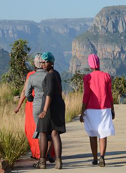 Vom Zaun an der Abbruchkante hat man hier den besten Blick auf die Three Rondavels. Tiefblau schimmert das Wasser des Stausees aus der Ferne. Daneben die riesigen Felskegel am gegenüberliegenden Rand des Canyons, sie erinnern mit ihrer Form an die traditionellen afrikanischen Rundhütten (Rondavels). Die harten Gesteinskuppen erodierten langsamer als die darunter liegenden weicheren Gesteinsschichten und so sind im Laufe der Zeit diese bizarren Felsen entstanden. Benannt wurden sie nach drei Frauen eines örtlichen Chiefs, der in einer Schlacht siegte. Auch hier sahen wir sehr viele südafrikanische Touristen aus dem gewachsenen schwarzen Mittelstand, die sich richtig in Schale geworfen hatten.